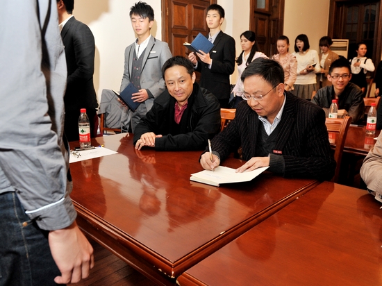 图为与会领导为同学们在上戏纪念册上签名寄语