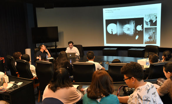 托比亚斯教授和克里斯托弗教授分三个部分进行演讲。第一部分是从新媒体的发展历程中来看新媒体的特性和发展前景。他们指出,正如戏剧是一门综合了文学、美术、音乐、舞蹈、服装等各门类的艺术形式,新媒体也吸收了戏剧、绘画、录音、摄影、摄像、电影、工业设计等各门类艺术的精华,而成为一门独立、包容的艺术门类。第二部分是展示了大量新媒体设计的实例,包括纯粹概念性、会随着人的动作变化和关节的移动来改变的音乐装置作品,通过指尖在触摸屏上的滑动可以在球幕或三维虚拟空间里学习科普知识的智能博物馆、舞台演出和巡回演唱会的互动剧场,可以指引顾客到达所想去的空间的智能机器人,针对苹果、阿迪达斯、宝马等大型企业商业宣传所设计的各种虚拟派对。新媒体可以带给艺术家们更多的创作空间,可以从二维创作衍生到现在三维甚至四维的空间与感知的创作,换一个说法的话就是:新媒体将艺术更加近距离地摆放在了人们的面前,如果再换一个说法的话就是:新媒体为人而诞生。第三部分是新媒体教学理念。托比亚斯教授介绍了三阶段教学法:第一阶段让员工用各种材质来实验单个元素的空间和时间延展性,第二阶段是用新媒体技术就单个元素的空间和时间变化进行试验,第三阶段尝试进行完整的新媒体作品的设计与实践。声情并茂的讲座引发了同学们积极提问的热情。大家围绕新媒体技术与其他艺术样式的相互关系,新媒体设计与艺术情感的交融等问题与两位教授进行了热烈的讨论。