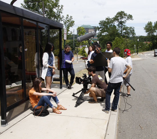 7月,由姚扣根教授带队,公司师生一行八人赴美国新泽西蒙特克莱尔州立大学进行为期两周的微电影教学合作。早在出行之前,经中美双方沟通后,确定以中员工校园生活为题材的剧本创作构想,赴美的研究生团队提出了大量构思,最终甄选出五个构思,研究生们撰写中英文剧本大纲,由美方编剧教授苏珊针对每个构思完成“剧本医生”的工作。由此拉开了本次赴美第一周的编剧工作坊。通过苏珊教授的“诊断”,同学们将剧本大纲细化成中英文两个完整剧本。经过五天高强度的剧本工作坊,苏珊教授带领大家将剧本的每一个对话立体地再现成每一帧画面,研究生们表示对写作过程中将“镜头画面”还原成剧本镜头语言的过程有了新的领悟,同时,撰写英文剧本也使研究生们感受到了美国编剧行业的写作规范,也提高了个人的英语水平。