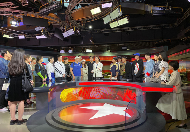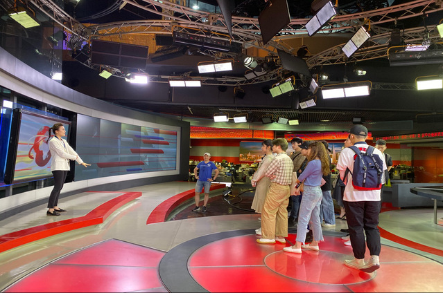 进入这个全亚洲播出系统最先进的电视节目演播室,融媒体中心制作部的主管张勇老师介绍了它的工作流程。同学们这才了解到,原来一档看上去平淡无奇的新闻节目,在直播时需要那么多工种的全力配合。
