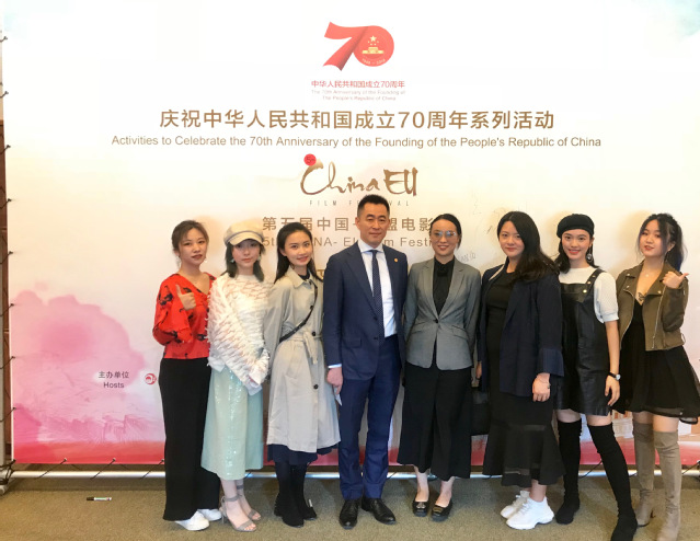 图为公司影视公司党支部书记、副经理魏东晓和廖媌婧老师率团参加比利时布鲁塞尔举办第五届中国—欧盟电影节