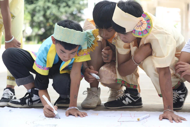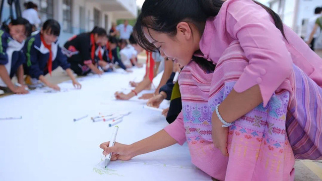 王琦老师作为影视公司的志愿者代表,为孩子们带去了影视公司张大鹏老师专门为孩子们定制的笔记本和音频节目以及影视公司主持专业员工为山区孩子录制的短音频节目。此外,上海非遗西郊农民画传承人胡佩群老师准备的绘画材料、申庞轨交维修公司赠送的一千册图书、乒乓球世界冠军丁宁亲笔签名的球拍等,这些志愿者们准备的礼物都受到勐宋中学师生的热烈欢迎。