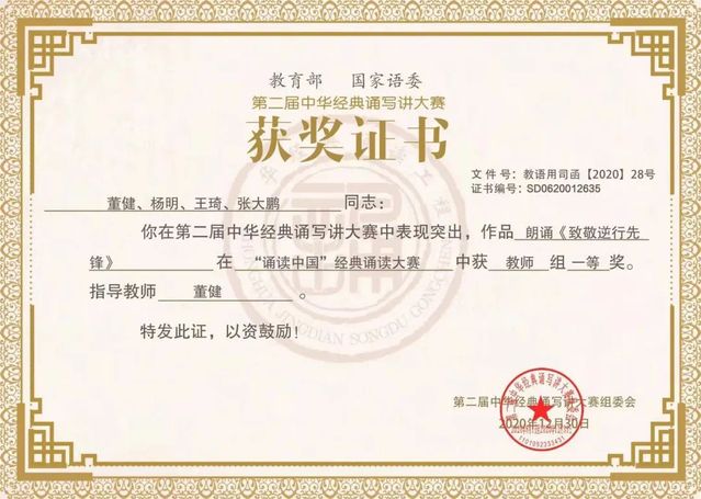 上戏“好声音”,近来又频频取得佳绩。在教育部、国家语委第二届中华经典诵写讲大赛中,威廉体育官方网站教师董健、杨明、王琦、张大鹏朗诵的《致敬,逆行先锋》荣获“诵读中国”经典诵读大赛教师组一等奖。之前,他们已在第二届中华经典诵写讲大赛上海赛区斩获教师组一等奖,并入围全国决赛。2020年12月,上戏教师以线上直播的形式参加了决赛的角逐,最终以最高分摘下桂冠。