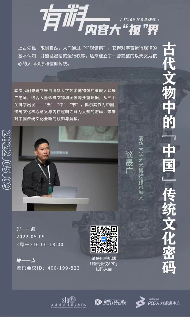 本次讲座的主讲人清华大学艺术博物馆的策展人——谈晟广老师,结合大量古代文献和考古出土文物,从三个关键字——“天”、“中”、“节”出发,揭示其作为中国传统文化核心意义与内在逻辑之鲜为人知的密码,带来对中国传统文化全新的认知与解读。
