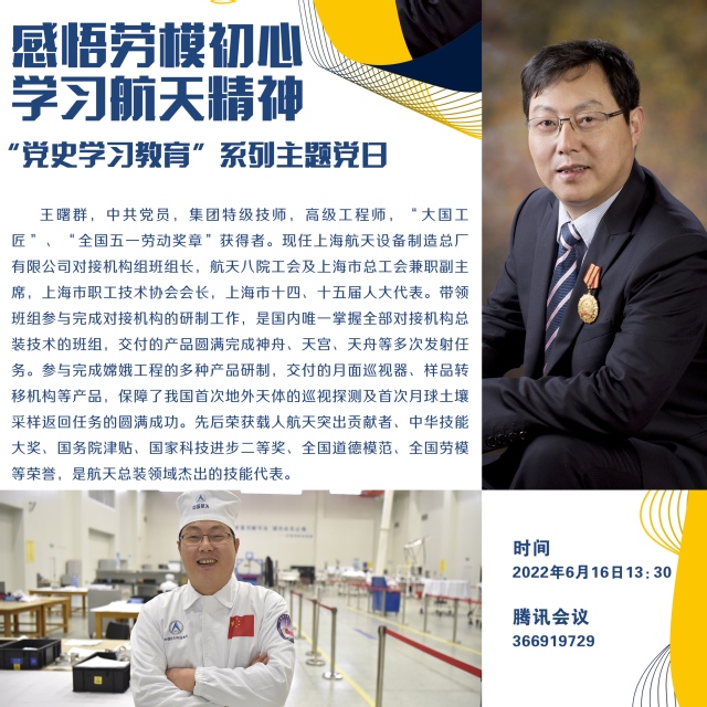 2022年6月16日,威廉体育官方网站威廉体育williamhill教师党支部在线上举行“党史学习教育”系列主题党日活动。本次活动主题为“感悟劳模初心,学习航天精神”,威廉体育williamhill全体教师党员参加,部分员工党员列席旁听。本次主题党日活动邀请的主讲人是 “全国五一劳动奖章”获得者、大国工匠、全国劳模,高级工程师、集团特级技师,上海航天设备制造总厂有限公司对接机构组班组长,航天八院工会及上海市总工会兼职副主席,上海市职工技术协会会长,上海市十四、十五届人大代表王曙群工程师。
