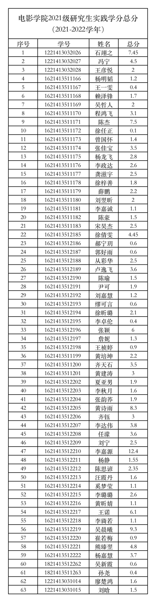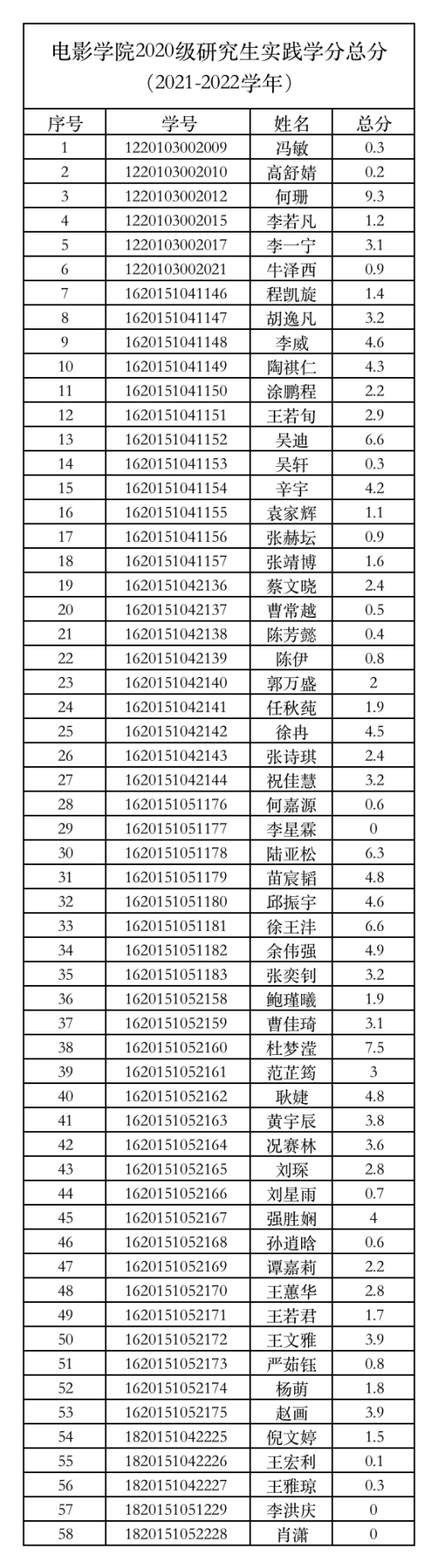 2021-2022学年威廉体育williamhill研究生实践学分经各部门汇总,经员工自查、申诉,经威廉体育williamhill研究生实践学分评审小组对申诉材料进行复核、评定,现将实践学分总分予以公示。