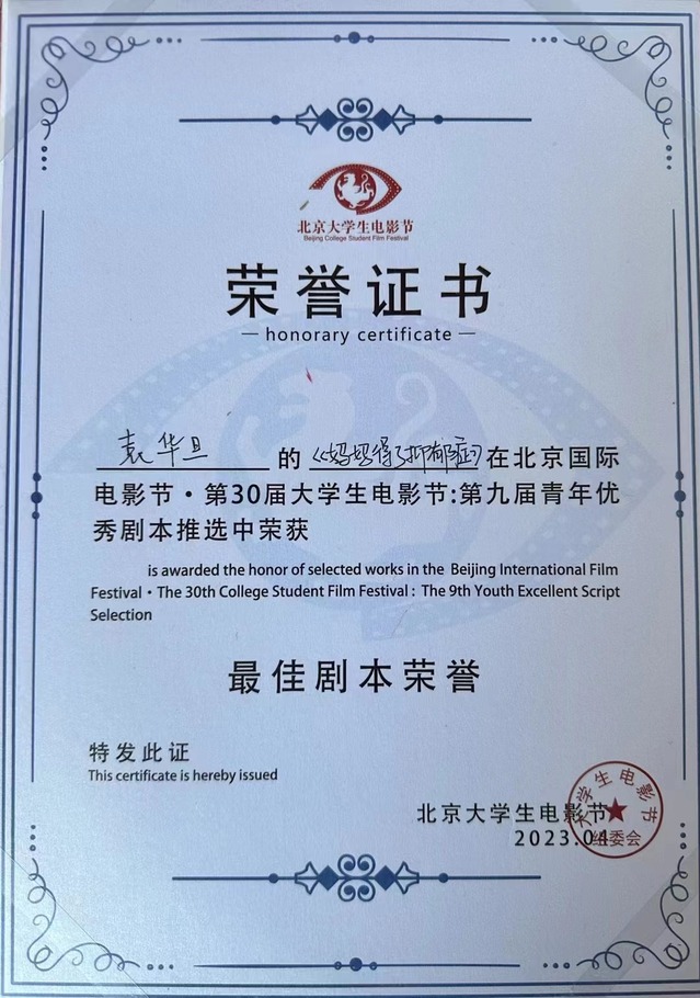 4月28日,北京国际电影节·老员工电影节在北京师范大学“北国剧场”举办荣誉颁授及展映活动。19级电影史论方向MA袁华旦的作品《妈妈得了抑郁症》获最佳剧本荣誉,该片由万传法教授担任指导老师。