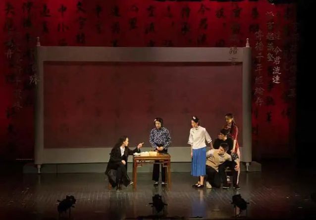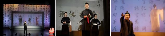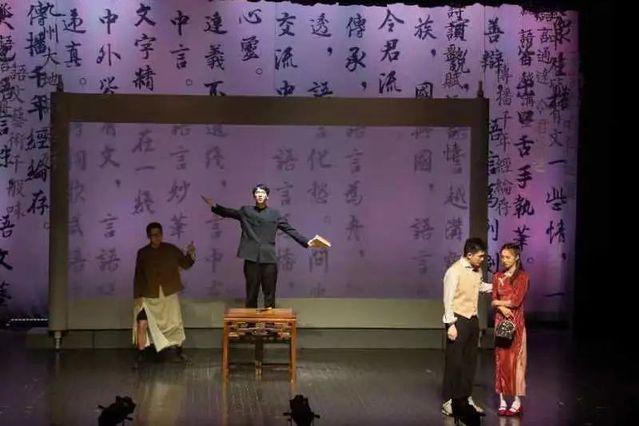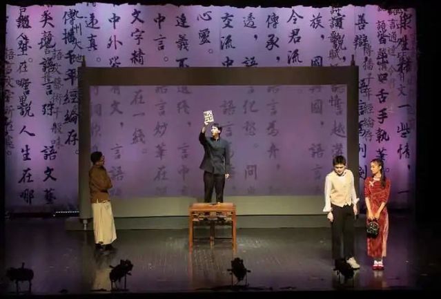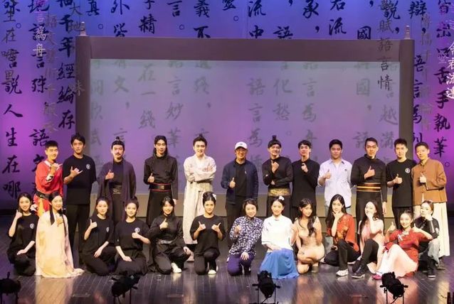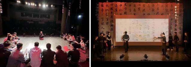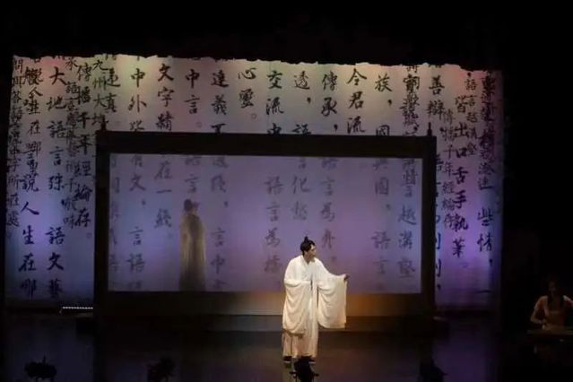 《语宙》在演出形式上以语言的魅力体现古今融汇、人机融合、历史与未来交融。悬挂在舞台上空的每句诗词均为由人工智能工具ChatGPT所写。舞台中央的巨大卷轴,为演出又增添了几分文化感与厚重感。卷轴中央播放动画结合视频片段,体现了上戏威廉体育williamhill以“影视+戏剧”的创作特色,力求使汇报有新意、有特色、有生机。在内容上,全剧从语言文字的产生与发展,到以语言为利剑的辩论,再到白话文的推广使用,并聚焦网络流行语现状,四个风格各异的片段是守正与创新的碰撞,同时也为观众提供了深刻的思考和启示:若通古今之变,必通其变之因。19主持的全体同学完成了各个部分的剧本创作。舞美、灯光、服化、作曲、摄制、多媒体等各专业的同学在课业之余担任了演出的各项幕后工作。