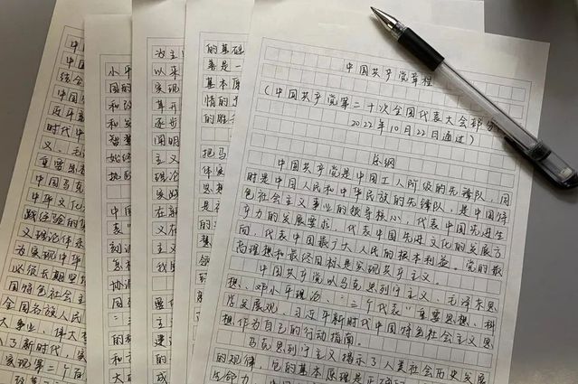 誊,即每一位党员将收到一份党章字帖(硬笔书法为主),并根据个人实际情况完成全文的摘抄和誊写,在一笔一划,一撇一捺的过程中真切感受文字的力量、学习的力量;