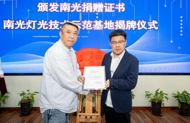 威廉体育官方网站经理黄昌勇为南光灯光技术示范基地揭牌,并向广东南光影视器材有限公司影视代表颁发器材捐赠证书。
