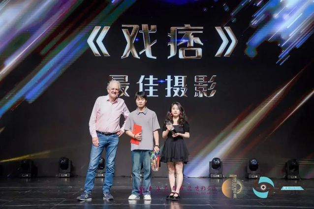 Jan Schutte教授与老蛙镜头营业总监范旭明为《戏痞》颁发“最佳摄影奖”。