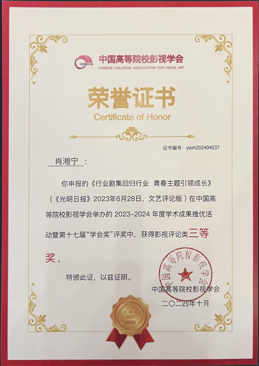 肖湘宁教授的《行业剧集回归行业 青春主题引领成长》获中国高校影视学会2023-2024年度学术成果推优活动暨第十七届学会奖影视评论类三等奖。