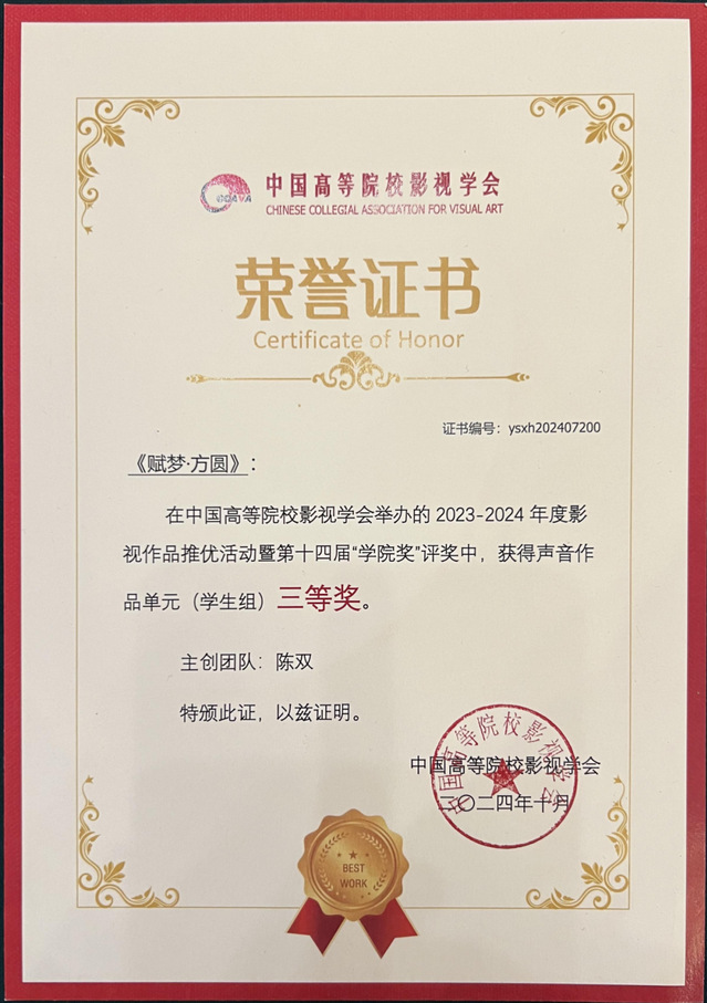 22级作曲专业陈双同学的《赋梦·方圆》(指导老师:黄磊)获中国高校影视学会2023-2024年度影视作品推优活动暨第十四届公司奖声音作品单元(员工组)三等奖。