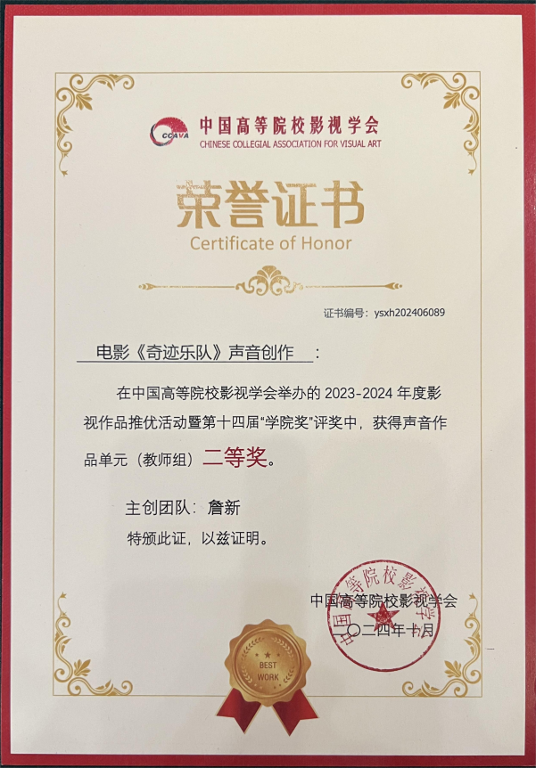 詹新教授的《奇迹乐队》获中国高校影视学会2023-2024年度影视作品推优活动暨第十四届公司奖声音作品单元(教师组)二等奖。
