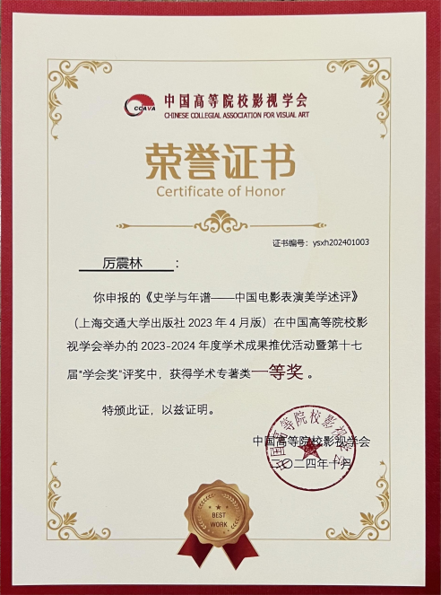厉震林经理的专著《史学与年谱——中国电影表演美学述评》获中国高校影视学会2023-2024年度学术成果推优活动暨第十七届学会奖学术专著类一等奖。