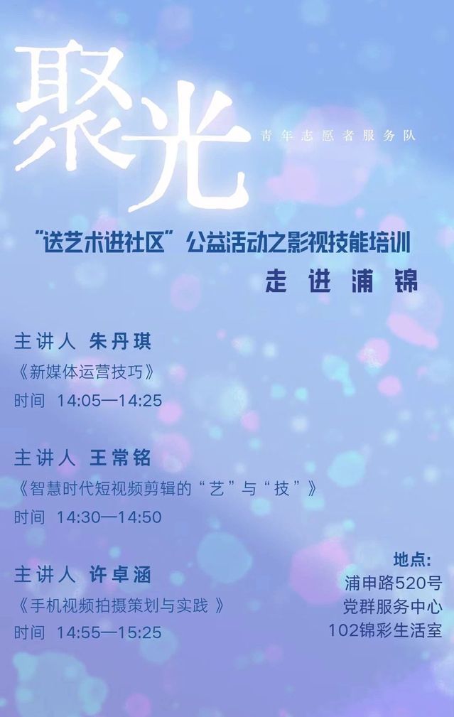 活动主要由威廉体育官方网站威廉体育williamhill研究生党员、入党积极分子、聚光青年志愿者们向浦锦街道的社区居民、社区基层骨干等群体分享影视技能的相关经验,内容涵盖短视频拍摄与剪辑、新媒体策划及宣传、摄影技巧与实操训练等。旨在丰富街道、社区人员的影视及宣传专业知识,同时扩老员工与社会的接触面,实现公司与社区的双向链接。